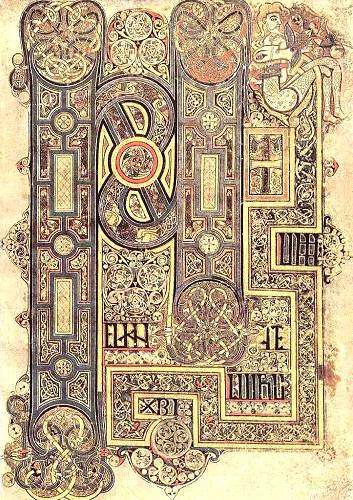 Das "Book of Kells"Zu Deutsch, das Buch von Kells. Ursprünglich wurde es im sechsten Jahrhundert von Columbans Mönchen in Iona begonnen, und später, zum Schutz vor den plündernden Vikingern, nach Kells in Irland gebracht und fertiggestellt. Es ist heute im Trinity College in Dublin in der "Old Library" ausgestellt. Hier ist die Titelseite für das Markusevangelium zu sehen. |