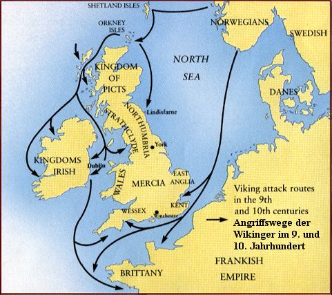 Im neunten Jahrhundert kamen sie! Ein erster Überfall der Wikinger geschah in Lindisfarne, an der Ostküste Schottlands schon im Jahr 793. Kurze Zeit darauf, also etwa von 800 an kamen immer mehr dieser Menschen aus der Gegend des heutigen Norwegen und wollten sich in Schottland, Irland und England ansiedeln. Eigentlich war